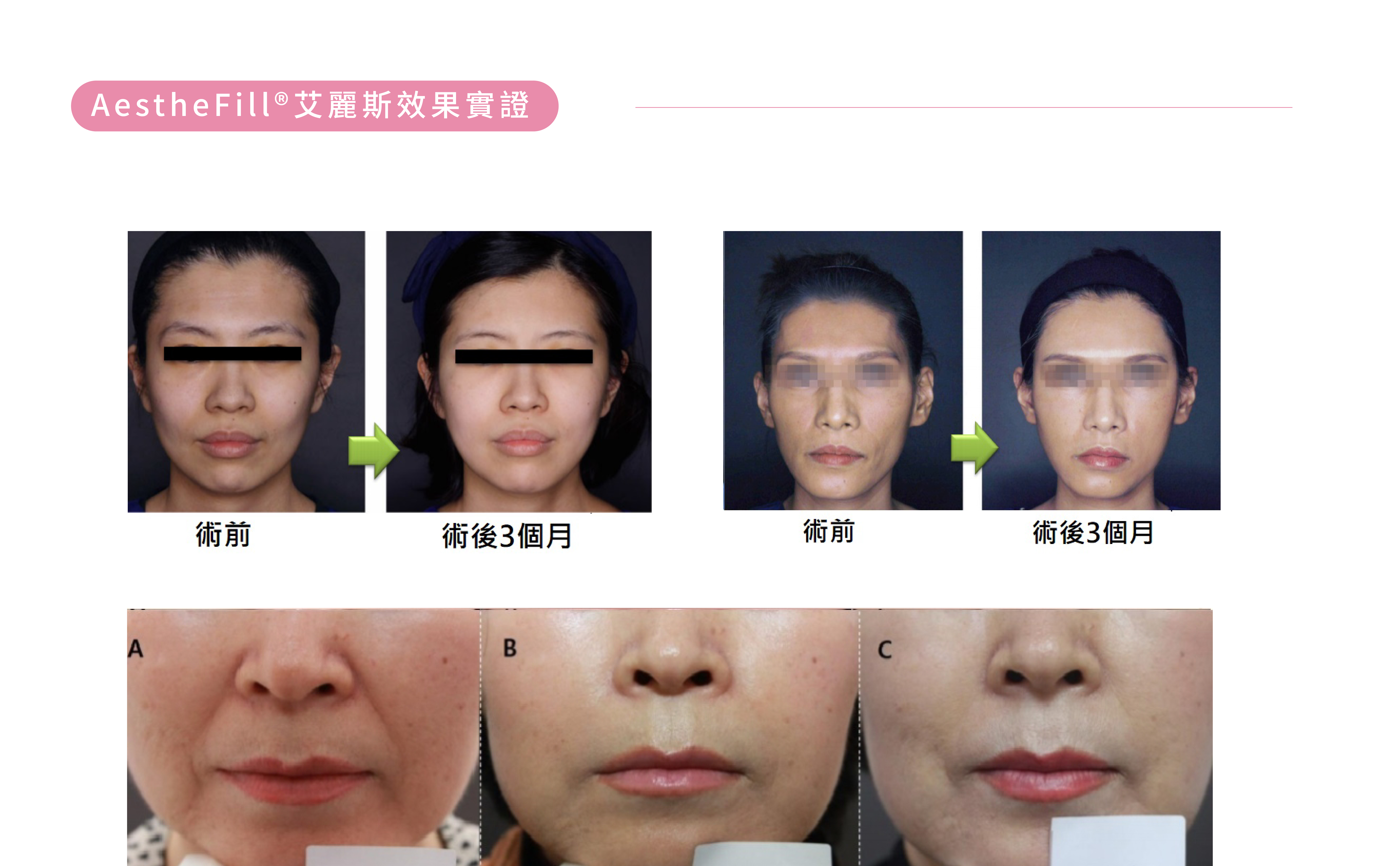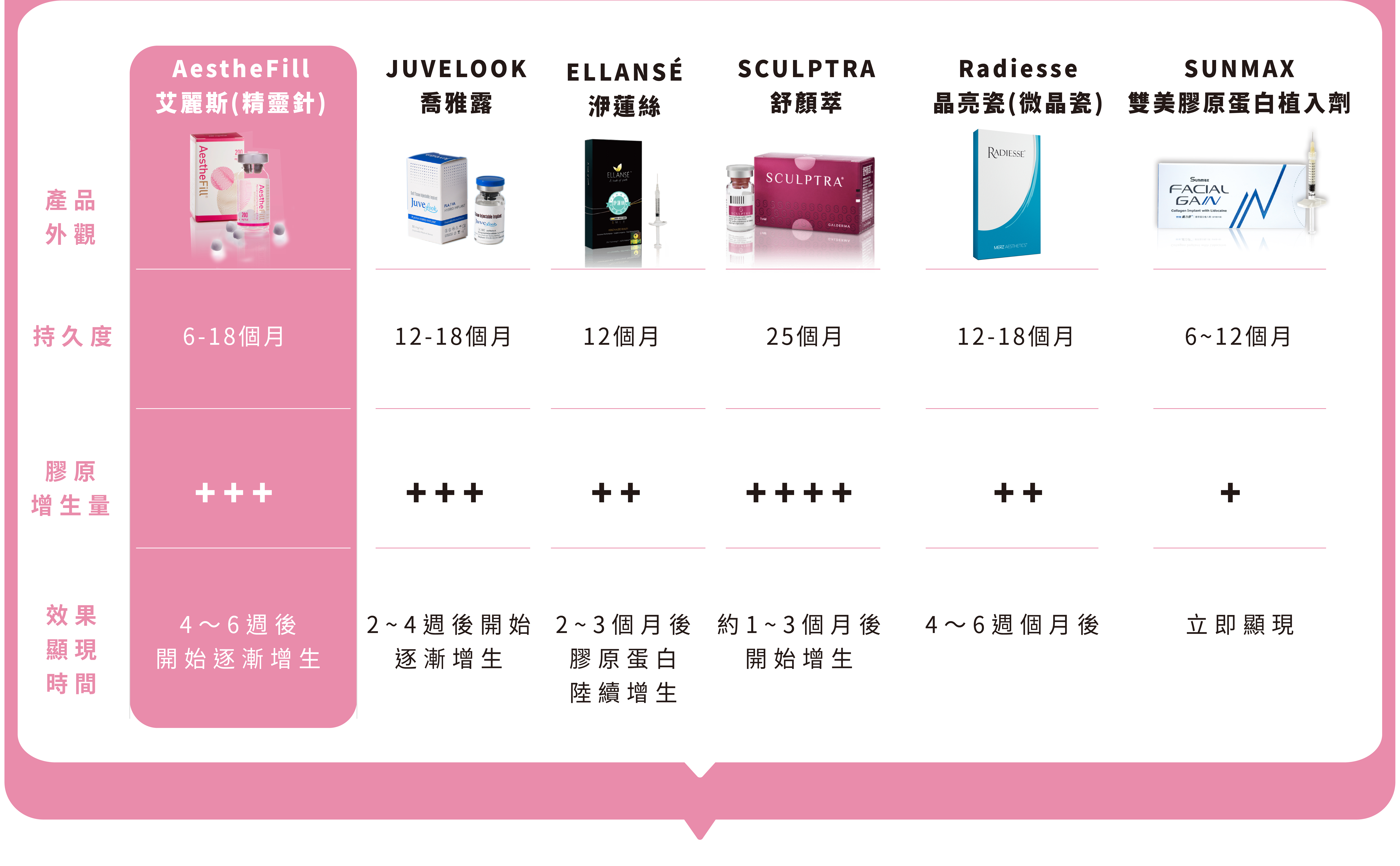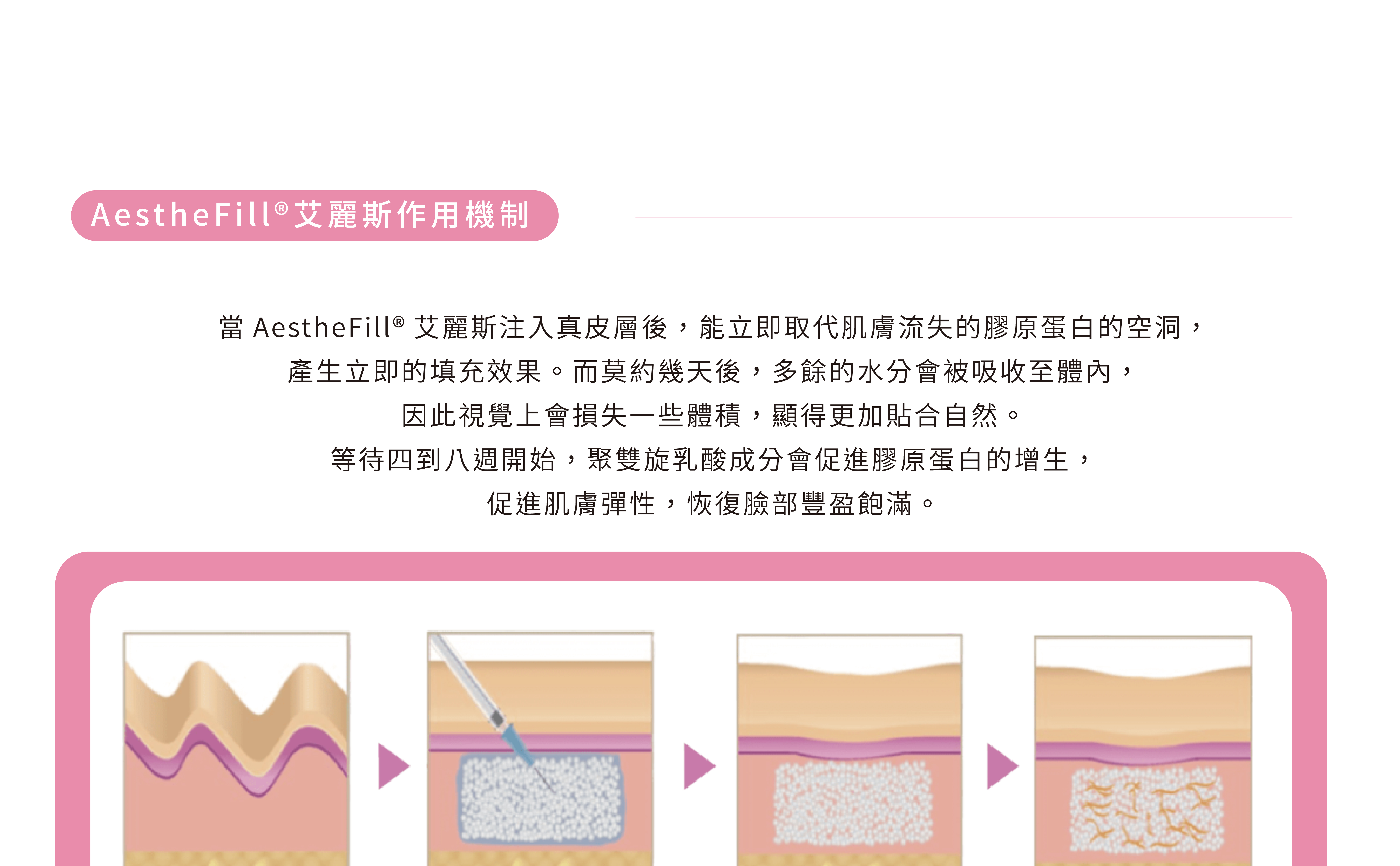 專為亞洲人設計的AestheFill®艾麗斯精靈針適合用於皺紋填補與臉部整體膠原蛋白增生等需求,包括太陽⽳(夫妻宮)凹陷、蘋果肌、雙頰凹陷、法令紋、⽊偶紋(⼝⾓紋)、下巴線條及臉部⽪膚的鬆弛下垂都能改善,同時具有立即顯現以及持續刺激膠原蛋白生長的特色,因此是改善老態、恢復肌膚膨潤彈性的絕佳選擇。此外,AestheFill®艾麗斯精靈針具有生物分解性,能通過體內代謝作用,最終排出體外,臨床副作用比率極少,是非常安全的產品。