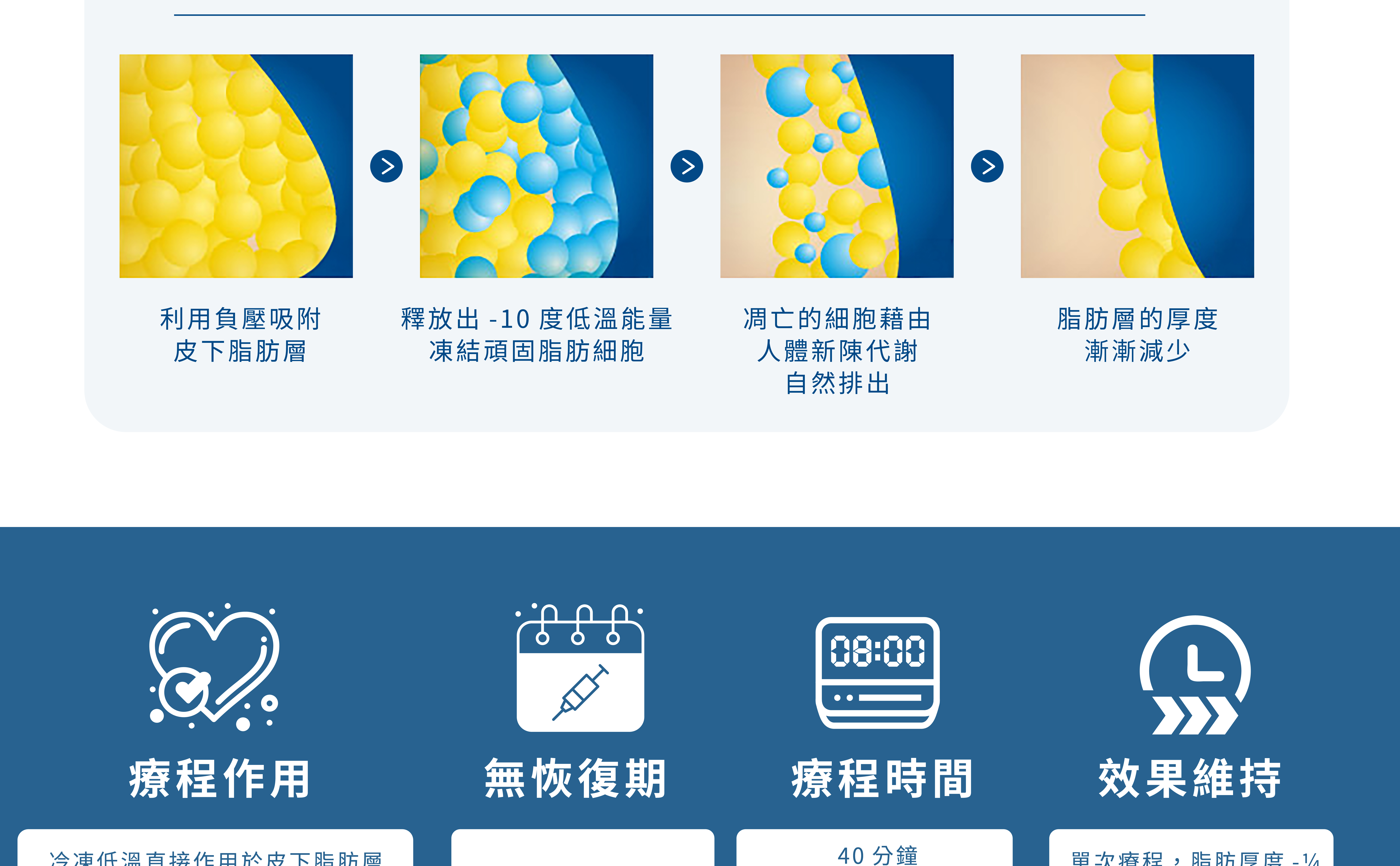 以 -10 度超低溫冷凍能量,將身體多處頑固脂肪結晶化,凋亡的脂肪細胞會透過人體代謝排出,患者將在 1-3 個月內感受身型曲線的明顯變化。