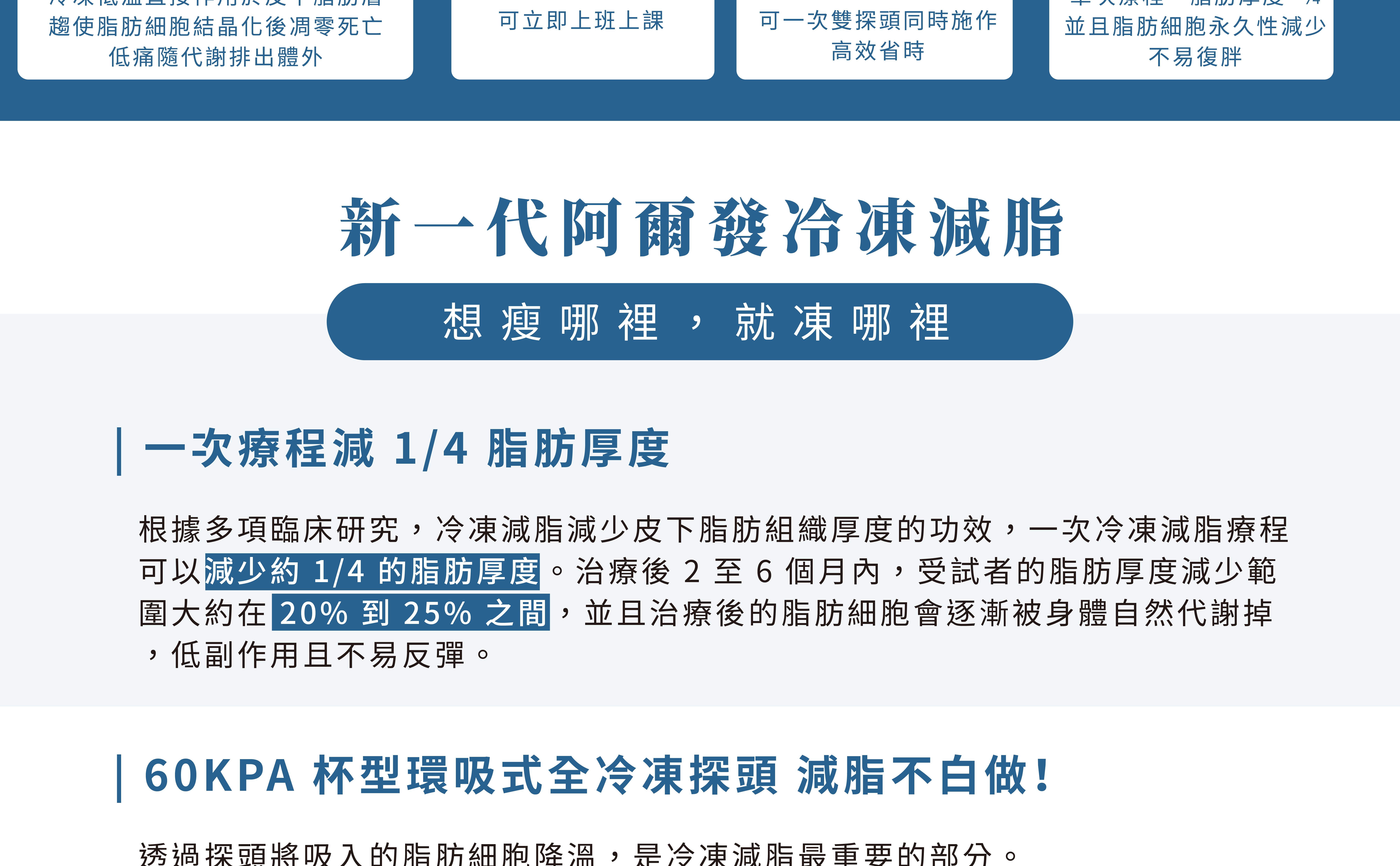 醫學研究指出每一次的凍脂療程平均減少 20~25% 的脂肪層厚度。(實際成果因療程規劃、作息與平日生活習慣相關,可能更多或較少)