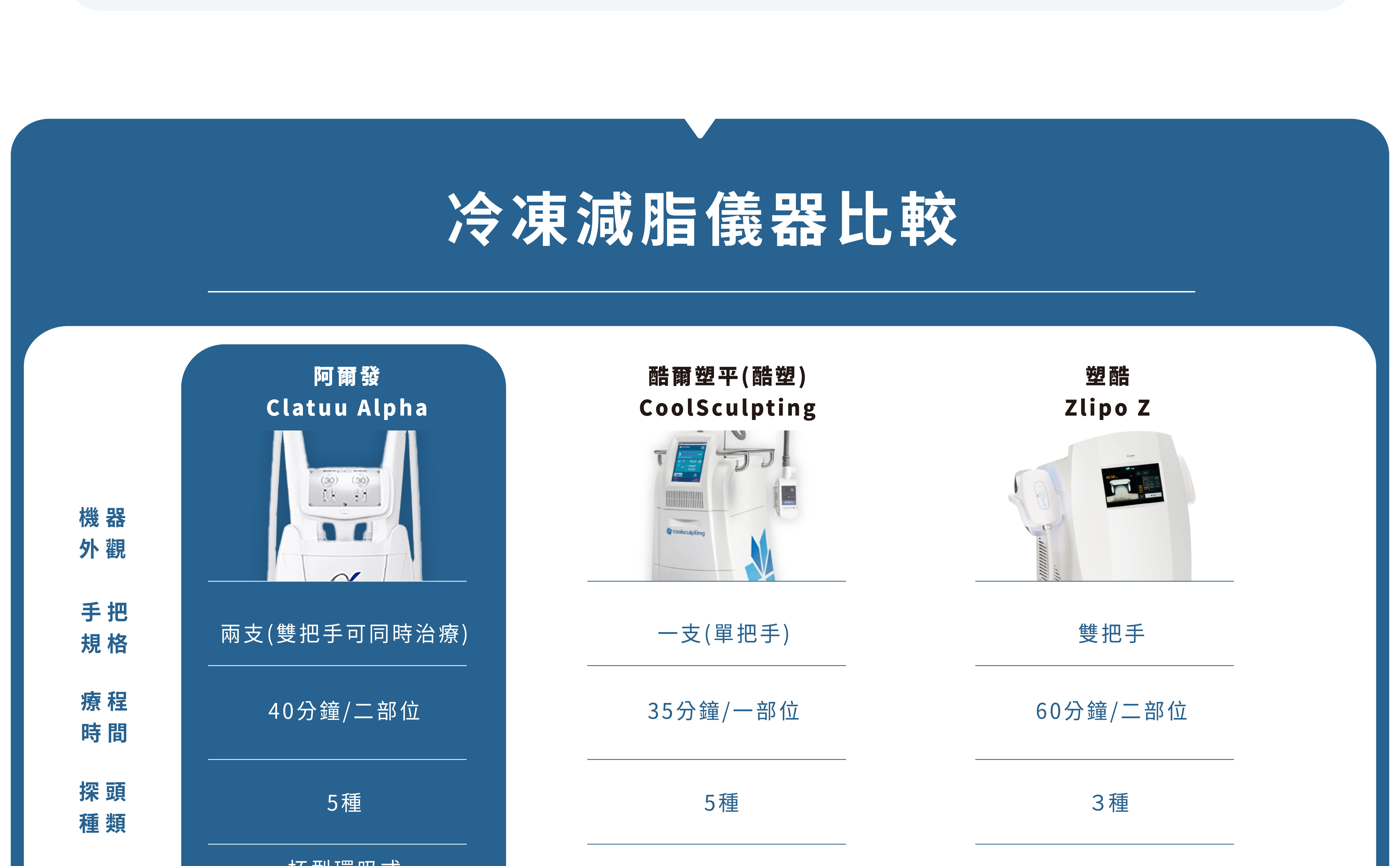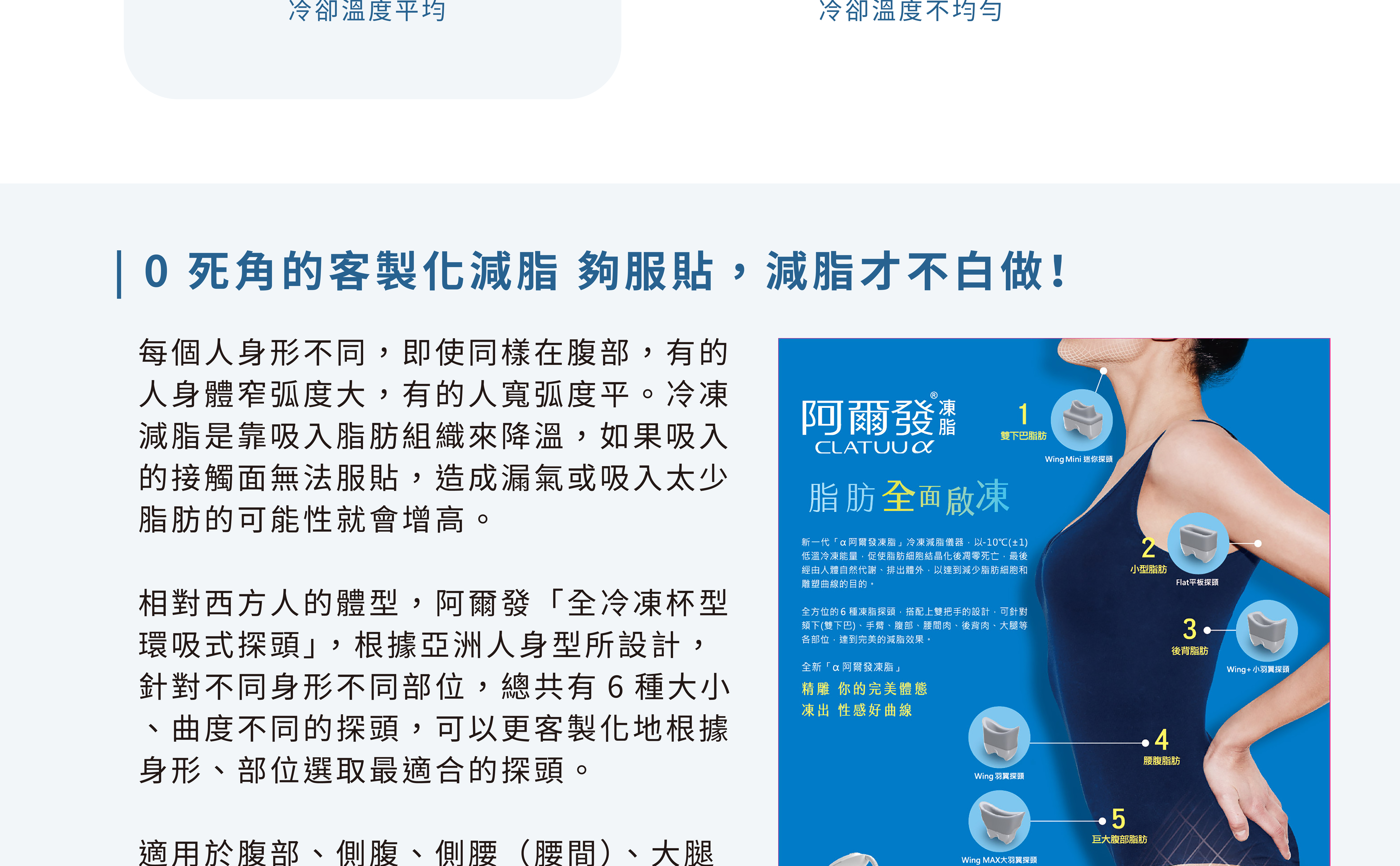 阿爾發是以人體脂肪分布為出發點而設計的凍脂儀器,非侵入式、沒有傷口,多樣化的探頭,身體的大腿、腹部、腰窩外觀及頦下等,都可以進行減脂、雕塑身材。