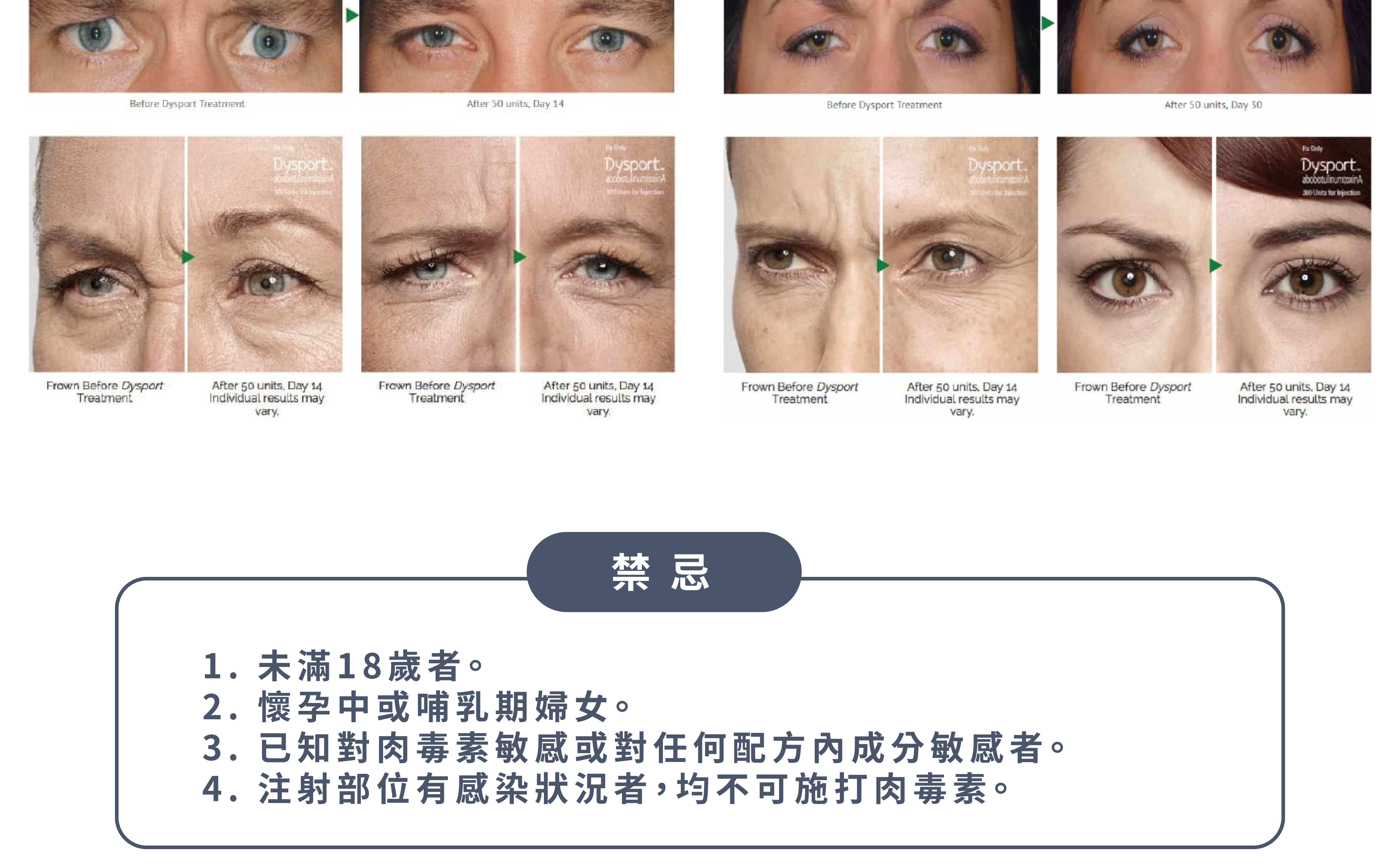 - 懷孕或哺乳中的婦女、對肉毒桿菌素過敏的族群請勿施打。如果您有正在服用的藥物(如:阿斯匹靈、肌肉鬆弛劑…等)或是您有神經系統、肌肉相關病史(如:重症肌無力,肌肉無力者、周邊運動神經病變疾病、肌萎縮性脊髓側索硬化症)或曾有呼吸困難、吞嚥困難相關疾病、心血管系統疾病,請務必告知您的治療醫師。