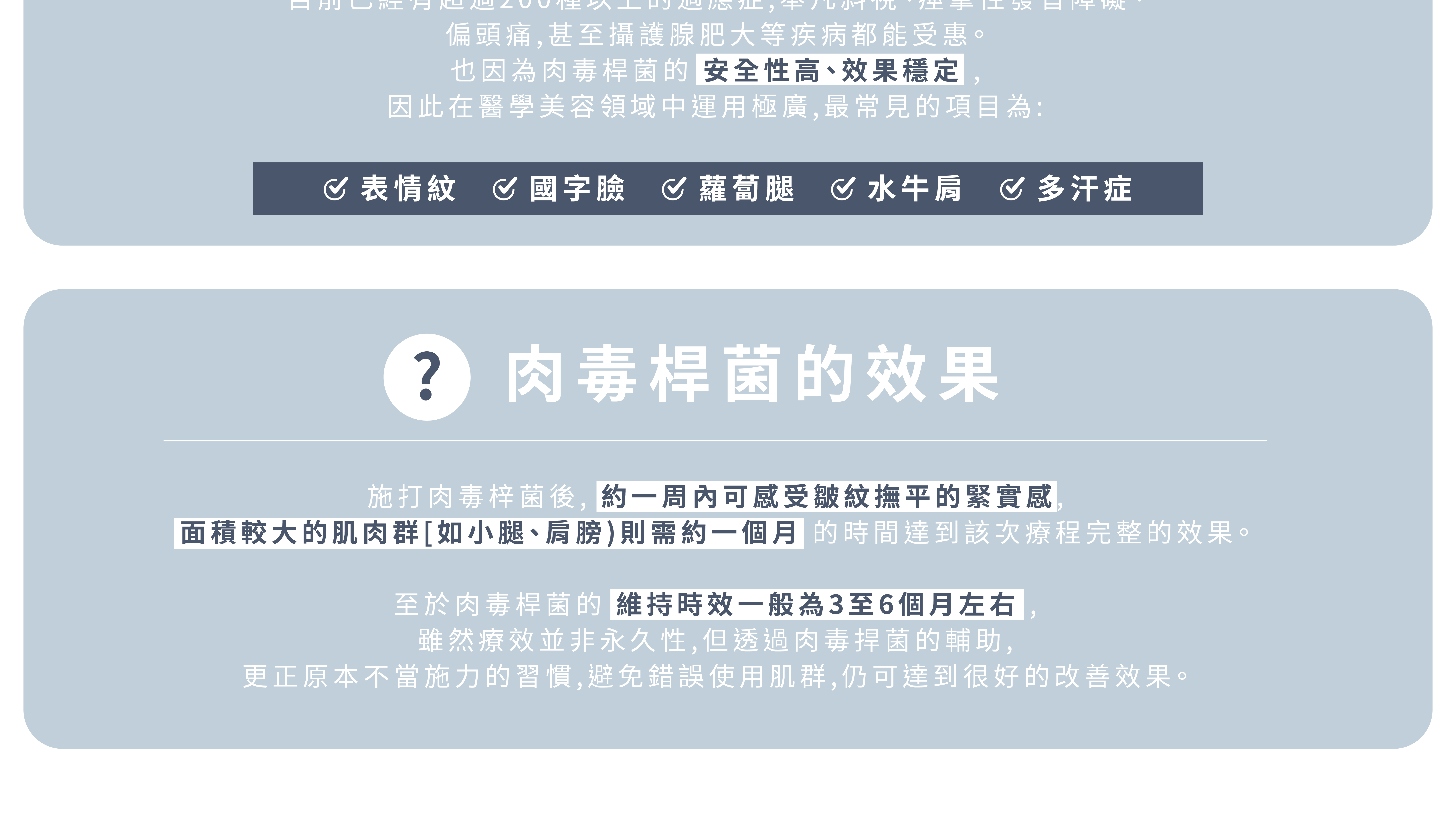 - 注射後可能感到些許腫脹、痠痛與不適,但通常極其輕微且數小時內就改善。