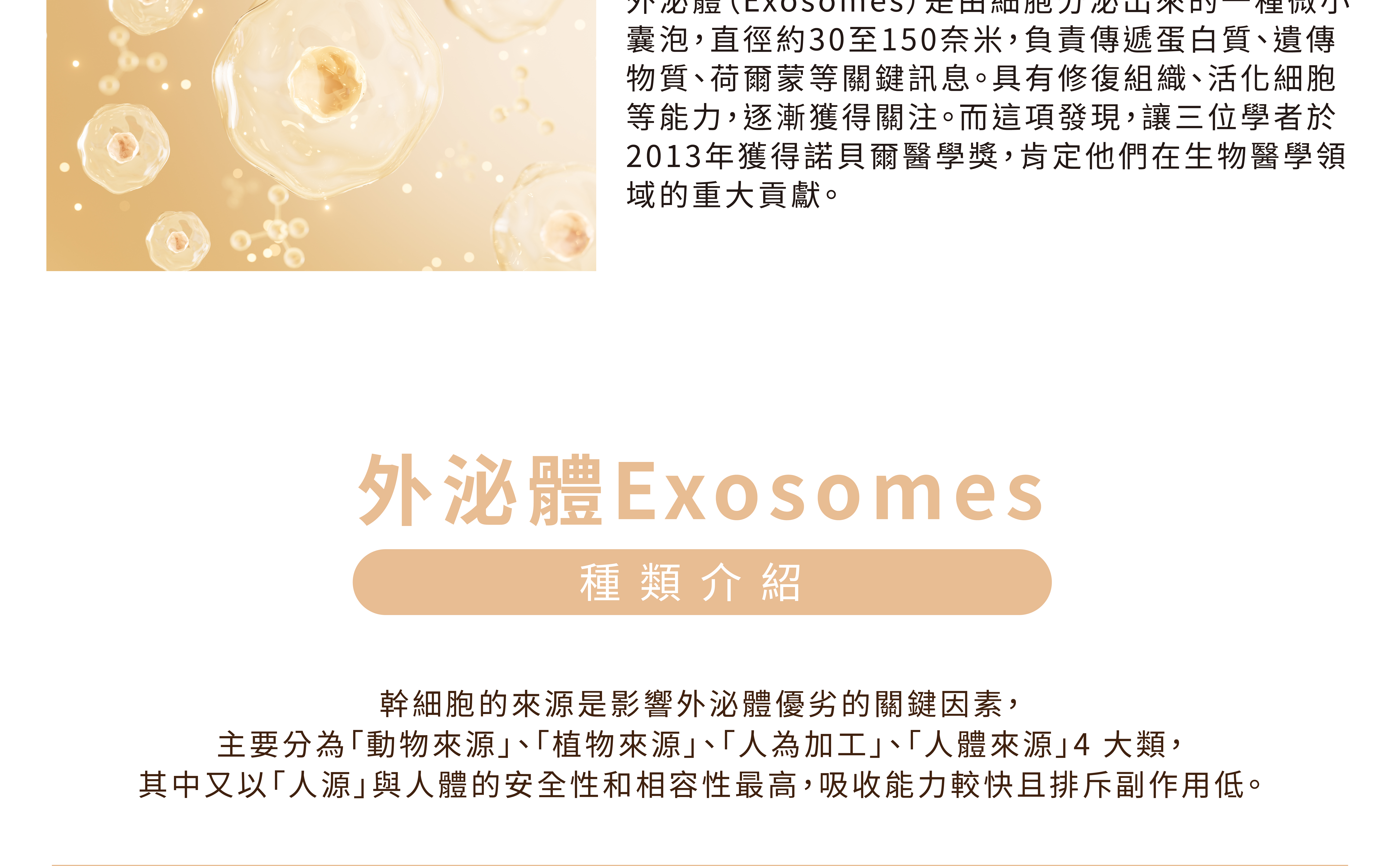 外泌體是幹細胞培養過程中釋放的微小囊泡。過去被認為是廢物,直到1980年後人們才發現其含有豐富的生物活性物質,如蛋白質、醣類、脂質,甚至是DNA和RNA。外泌體的角色類似於傳令兵,它們在細胞間傳遞訊息,協助細胞溝通和功能執行。