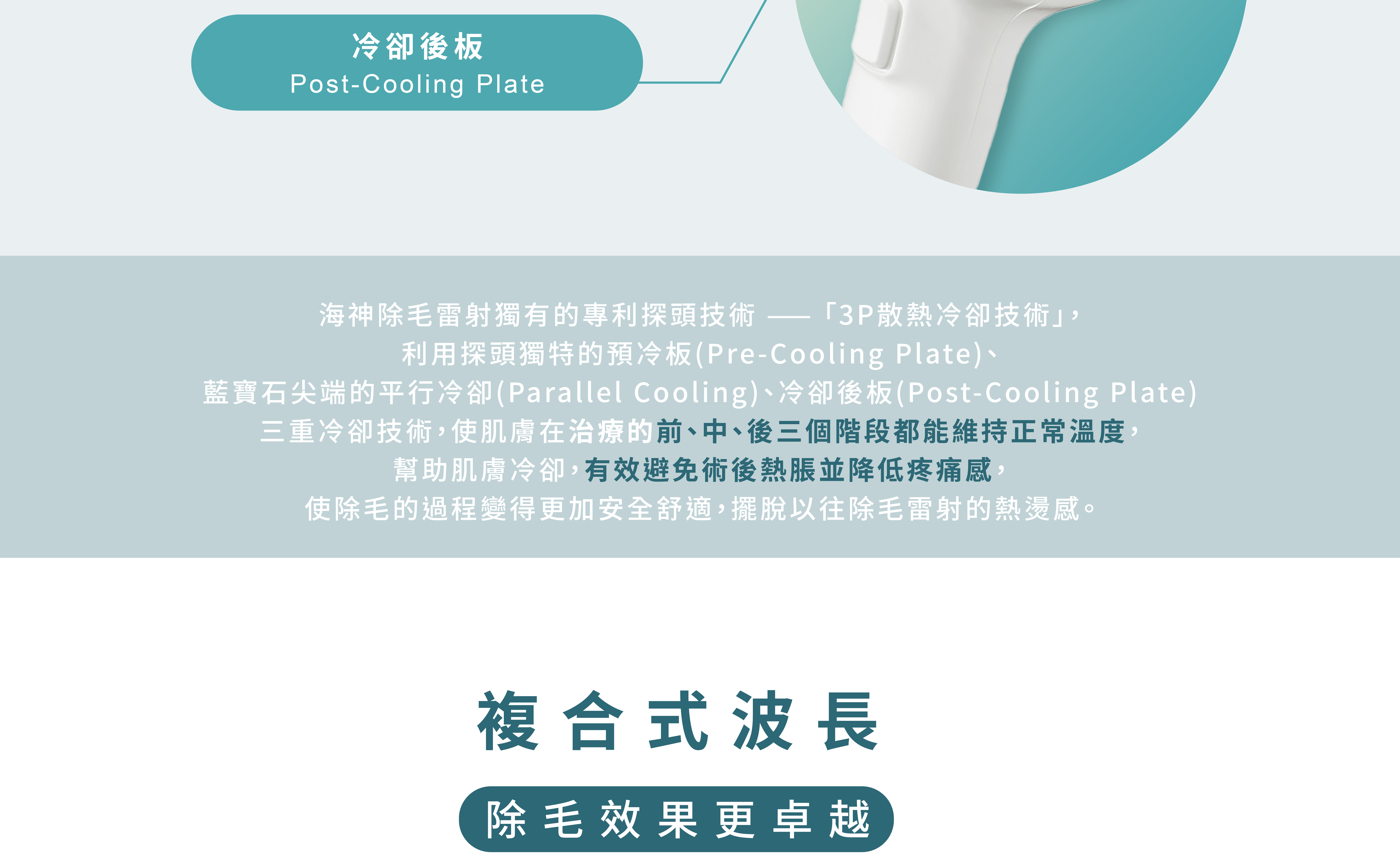 海神除毛擁有優越的3P冷卻專利技術,在治療前、中、後做皮膚冷卻,帶走不必要的熱能,大大降低疼痛感,對治療區域更加溫和舒適。